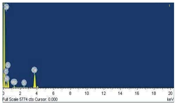 活性炭的表面化學成分是通過使用能量色散X射線(EDX)光譜確定的。得到的光譜見圖2,C、N、0、Mg、Ca的百分比分別為7.64%、14.53%、35.31%、0.70%、41.80%。FTIR結果支持C、N和O的存在,該結果表明存在羰基和胺基團。除此之外,高百分比的Ca表明主要是鈣的性質。此外,光譜中出現Mg表明Mg化合物與碳和氧強烈結合。因此,無論是用熱蒸餾水還是冷蒸餾水,都不容易通過洗滌去除。