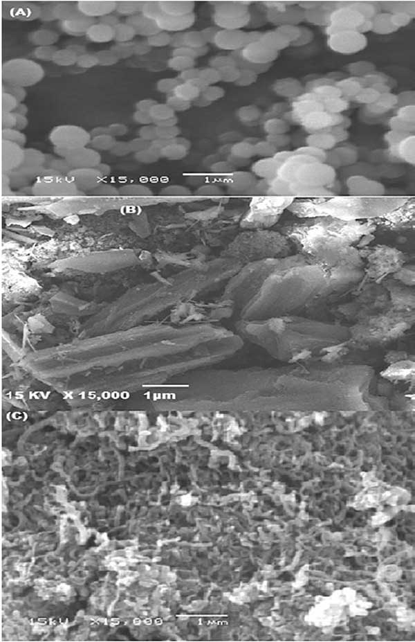 這種方法是檢查活性炭表面形態(tài)的有用方法。圖1A和1B展示了丙烯腈-共聚苯乙烯(A)和活性炭浸漬后的(B)SEM照片。這些圖顯示了球形、均勻形狀的結構,改性方法導致改性復合顆粒尺寸增加了7.95%。此外,圖1C顯示了制備的納米碳管的SEM圖片。該圖顯示了未處理樣品中存在無定形碳。此外,值得注意的是,這些管子又細又長,并且沒有大量凝聚在一起。納米碳管的管狀直徑介于75和99.25nm之間。