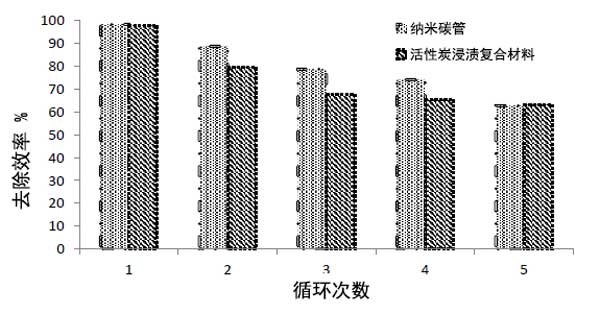 活性炭復合材料的再生具有經濟重要性。該實驗涉及許多吸附-解吸循環(huán),以估計重復脫色對納米材料吸附效率的影響。發(fā)現納米碳管和活性炭浸漬材料對活性紅的去除效率略有變化,如圖3所示。數據顯示原始納米碳管和活性炭浸漬材料存在差異與不同初始活性紅染料濃度下重復使用的納米化合物相比。活性紅的吸收程度在第一個循環(huán)后達到98.18%,然后在五輪納米碳管后降低到62.72%,而對于活性炭浸漬材料,第一個循環(huán)去除效率為97.72%,在第一個循環(huán)后,在五輪后降低到63.18%,表明其再生有效性,如圖3所示。因此,可以得出結論,納米碳管和活性炭浸漬材料的吸附過程會受到延長重復使用周期的影響,而不會損失大量染料吸附能力。因此,兩種納米化合物被多次用于從水性階段去除活性紅染料。因此,這表明它們可以多次使用,證明了它們的經濟可行性。