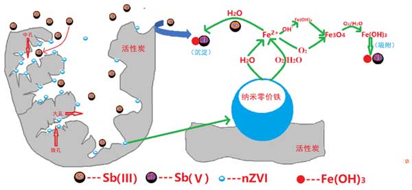 氧氣對銻(III)的氧化非常緩慢。然而,有人聲稱當零價鐵被氧氣腐蝕時,會產生強氧化劑,可以氧化各種有機和無機分子。在酸性條件下,兩個電子從鐵離子表面轉移到氧,產生過氧化氫。在低pH值下,過氧化氫與鐵離子的相互作用形成羥基自由基(OH-),而在pH值超過5.0時,它通過反應生成鐵(IV)。我們之前的研究發現活性炭對砷(III)的氧化影響比較大。這是因為活性炭表面富含官能團,當砷(III)擴散吸附在活性炭表面時,這些官能團被氧化。此外,因為銻(III)比砷(III)氧化得更快,所以銻(III)可以被活性炭快速氧化。在沒有弱磁場的情況下,零價鐵介導的銻(III)去除通常由兩個時間段組成;谏鲜鼋Y果和討論,銻(III)的去除是一個復雜的過程,包括表面吸附和氧化。圖3描繪了銻(III)去除的機制。
