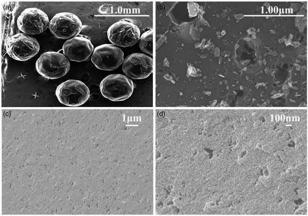 SEM被用于研究活性炭的形態(tài)、表面粗糙度和粒度。其內(nèi)部孔隙結(jié)構(gòu)信息也可以通過(guò)橫截面的SEM進(jìn)行分析。SEM圖像顯示球型活性炭具有均勻的球形,粒徑(直徑)約為600μm(圖1a)。表面比較光滑,有較大的裂紋和孔隙結(jié)構(gòu),表面有許多無(wú)序的微晶結(jié)構(gòu)(圖1b)。橫截面顯示了一些分布均勻的相對(duì)均勻的孔隙(圖1c和1d)。