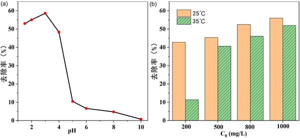 溫度也影響吸附過(guò)程?疾炝瞬煌瑴囟认虏煌瑵舛却姿崛芤旱奈竭^(guò)程,其他條件不變。結(jié)果如圖2(b)所示。對(duì)于不同濃度的乙酸稀釋劑,25℃時(shí)的吸附去除率高于35℃時(shí)的吸附去除率,表明吸附過(guò)程是放熱的。因此進(jìn)一步的實(shí)驗(yàn)僅在25℃下進(jìn)行。對(duì)于工業(yè)應(yīng)用,室溫條件是可行的,無(wú)需提供額外的熱源。