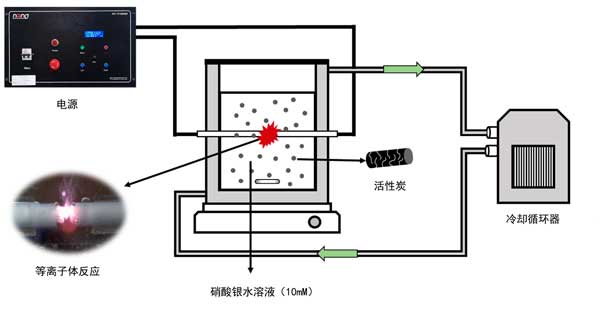 研究中用于制備銀納米顆粒沉淀活性炭的液相等離子體裝置在圖1顯示。使用左上角的電源為安裝在石英反應器中心的鎢電極供電。此時,脈沖寬度為5μs,施加電壓為250V,頻率在30kHz的運行條件下運行。液相等離子體反應器采用雙管式制造,為防止等離子體產生的熱量導致溫度升高,在反應器外通道循環冷卻水,使反應溶液的溫度保持恒定在15℃。