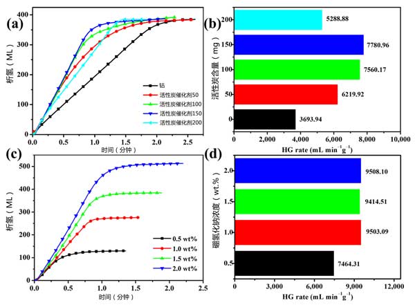 圖2:在鈷中添加了(a,b)量的活性炭,(c,d)硼氫化鈉濃度的所制備樣品的產氫率。
