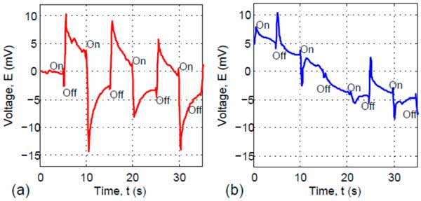 對含二氧化鈦的碳纖維復合材料進行了光敏性測試。熒光燈管用于產生可見光。電化學工作站用于記錄光子電壓響應數據。將復合碳纖維置于透明載玻片上,并使用鋁箔條形成導電路徑。將光源控制為“開”5秒,然后“關”5秒。得到的測試結果如圖2所示。曲線如圖2,發現該纖維樣品所具有半導體行為。當可見燈泡切換到“開”位置時,光照導致陽極產生電子,電壓變得更負。然而,當燈“關閉”時,發現電壓出現正浪涌,如圖2a所示。這種n型行為與在活性炭化纖維中添加鈷摻雜的鈦基氧化物顆粒有關。如果沒有鈷此外,光敏性是沒有那么強,如圖2陽極處的光子感應電壓不是那么穩定,這也顯示在圖2b中,基線漂移較大。