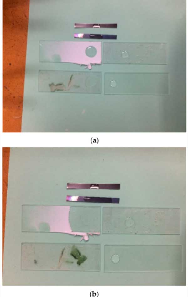 圖3:暴露在陽光下10分鐘(a)和暴露20分鐘(b)后載玻片上的油滴照片。