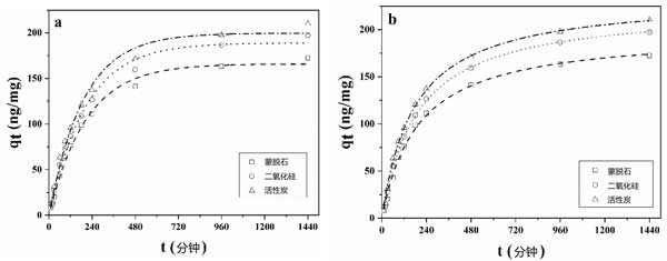 圖2:(a)黃曲霉毒素在活性炭和其它吸附劑上吸附的擬一級動力學模型擬合曲線和(b)擬二級動力學模型擬合曲線。
