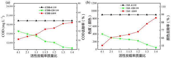 圖1:活性炭載鋁質量比對(a)COD和(b)2小時色度去除的影響。