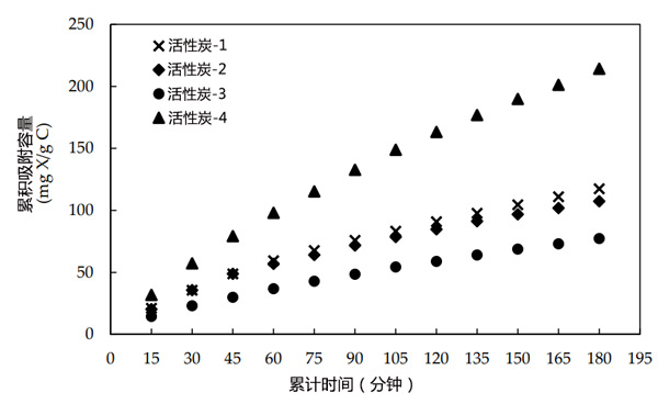 活性炭是去除有機(jī)物的常用吸附劑。吸附性能主要取決于其比表面積和微孔結(jié)構(gòu)。它們具有較高的內(nèi)部孔隙率,因此具有較高的吸附性。在本研究中,對四種具有不同表面性質(zhì)的顆粒活性炭樣品(活性炭-1、2、3和4)進(jìn)行了去除黃藥的測試。將兩克活性炭樣品與50毫升1590毫克/升的黃藥溶液混合15分鐘。過濾活性炭,并用紫外-可見光譜法測量溶液中的殘余黃藥。通過重復(fù)使用碳樣品,重復(fù)該程序12次,以達(dá)到大吸附量。如圖1所示,活性炭-4的吸附容量比較高,因此選擇其進(jìn)行進(jìn)一步研究。