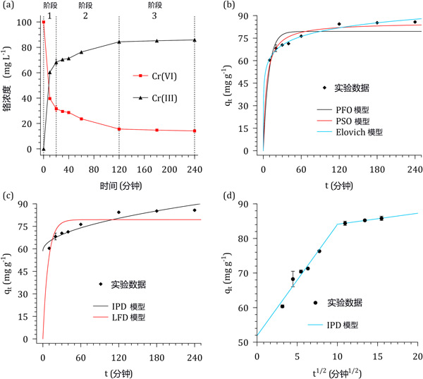 圖2:(a)六價鉻溶液和浸漬活性炭接觸時間對Cr濃度和形態(tài)的影響。(b)反應(yīng)動力學(xué)模型、(c)擴散模型和(d)線性化的顆粒內(nèi)擴散模型。