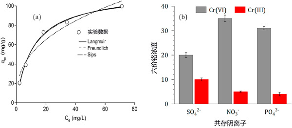 圖3:(a)浸漬活性炭吸附六價鉻的平衡等溫線,(b)競爭陰離子對平衡鉻濃度的影響。