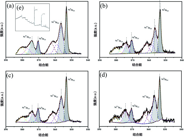 圖1:Ni2p在(a-d)多種活性炭​​催化劑上的XPS圖,(e)載鎳活性炭催化劑。