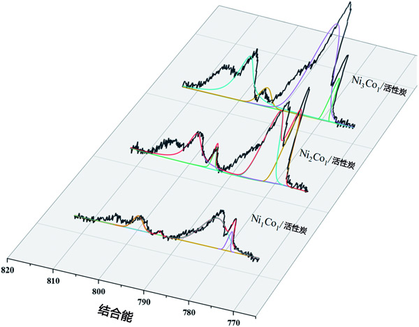 采用X射線光電子能譜(XPS)對多種活性炭催化劑進行表面分析,并對鎳和鈷進行表征氧化態。Ni02p光譜表現出兩個貢獻,2p1/2和2p3/2(由自旋軌道分裂產生),分別位于870eV和852.4eV(圖1a-d),可以分配給存在金屬鎳。O1s峰和Ni2+的存在,這可以通過在873.8eV(Ni2+2p1/2)和852.8eV(Ni2+2p3/2)的主峰上觀察到的肩峰來證明,表明樣品在暴露于大氣層。類似地,催化劑中Co2p的XPS光譜(圖2)顯示出四個主峰,結合能分別為778.45eV、782.7eV、793.66eV和798eV,對應于Co02p3/2、Co2+2p3/2,Co02p1/2和Co2+2p1/2。此外,根據載鎳活性炭,已觀察到載鎳鈷活性炭​​的結合能偏移隨著鈷負載量的增加而增加,最大偏移約為0.3eV。在比較這些樣品時,從載鎳活性炭到載鎳鈷活性炭​​向更高結合能的轉變提供了鎳、鈷和載體物質之間相互作用的證據。