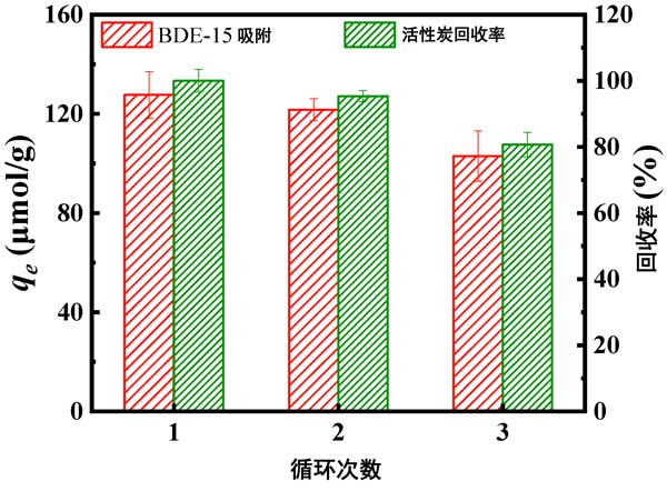 為研究活性炭處理洗脫液后的循環(huán)利用性能,采用甲醇洗脫活性炭進(jìn)行再生回用。如圖3所示,在三個回收-吸附循環(huán)中,活性炭的吸附量略有下降,活性炭的吸附量保持在103μmol/g以上,下降了25μmol/g(下降了19%)。活性炭表現(xiàn)出良好的可回收性和可重復(fù)使用性,有利于實際應(yīng)用。