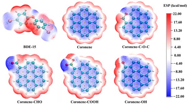 圖5:BDE-15和不同結(jié)構(gòu)活性炭在水溶液中的ESP圖。