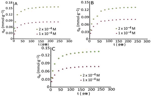 圖1:接觸時間和初始濃度對25℃時乙基橙(A)、甲基橙(B)和間苯胺黃(C)在活性炭上吸附的影響。