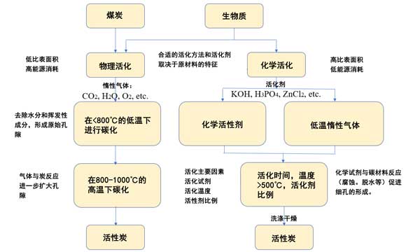 活化過程是活性炭制備的核心階段,是前驅體孔隙結構的進一步擴大。活化過程包括三個主要階段:焦油物質的消除、基本碳晶體的燃燒和碳顆粒的氧化。主要因素有活化類型、活化劑、活化溫度、浸漬比、活化時間、氣體分壓等。活化方法可分為物理活化、化學活化、物化偶聯活化法、微波活化、模板法等,最常用的方法是物理活化和化學活化。物理活化和化學活化衍生的活性炭制備見圖2。