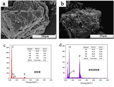 圖1:活性炭(a)和改性活性炭(b)的表面形態和活性炭(c)和改性活性炭(d)的EDAX光譜。