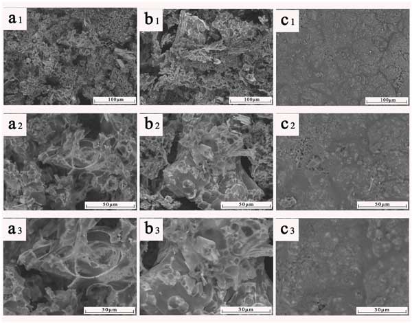 當加載足夠的改性活性炭時,膨脹的殘余碳可以通過其質量、連續性和致密性得到證實,這些都得到了極大的改善。一般來說,膨脹的殘余碳可以減少凝相和氣相之間潛在的熱和傳質,這反過來又會引起燃燒抑制。經過錐形量熱儀測試后如圖4中的圖案所示,可以注意到殘留碳的顯著形態差異。在改性活性炭6%和改性活性炭9%的表面上可以看到空隙和裂口(圖4a1、b1),它們可以作為熱量的擴散途徑,并且在燃燒過程中會揮發。此外,相比之下,改性活性炭9%在表面提供了精細的皺紋覆蓋層(圖4c1),這產生了有效的凝聚相阻燃性,此外,皺紋形態可以作為復合材料的增強框架。