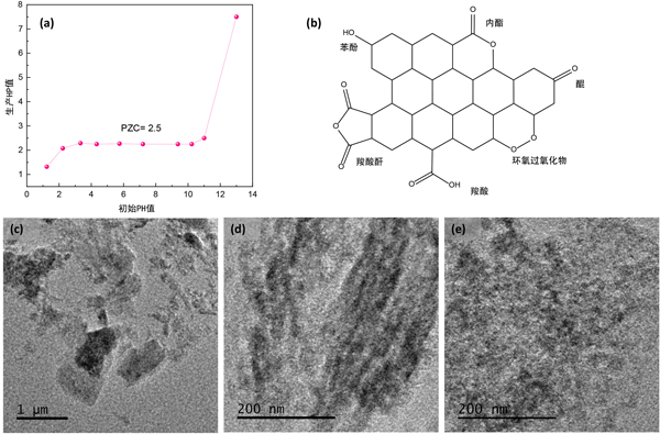 圖1:活性炭載體的研究:(a)零電荷點(PZC)的測定:反應24小時后所得pH值作為起始pH值的函數(shù)。(b)不同含氧基團。