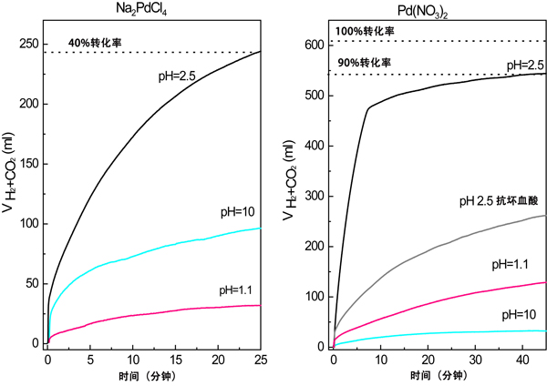圖2:對于通過使用兩種Pd前體在不同的浸漬pH值下制備的活性炭催化劑,所產(chǎn)生的重整氣體(H2+CO2)的體積隨時間變化。