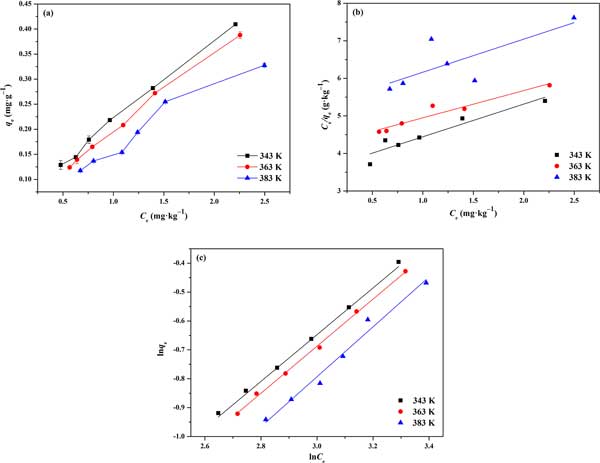 圖2:活性炭對玉米赤霉烯酮的吸附能力(a)和Langmuir(b)和Freundlich(c)等溫線的擬合圖。
