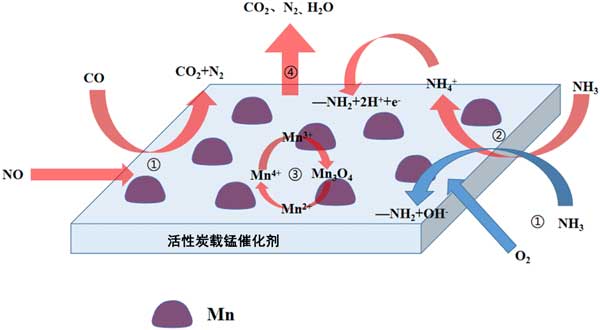(4)最后,催化劑表面產生的氣體(CO2、N2和H2O)解吸并通過活性炭孔擴散到內表面。然后,氣體從活性炭內表面擴散到活性炭載錳催化劑的外表面。根據上述反應過程,提出活性炭催化劑低溫CO+NH3偶聯脫硝機理圖在圖4示。