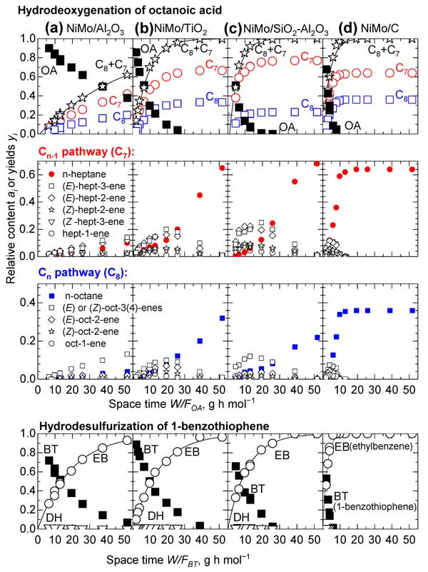 NiMo/Al2O3(活性最低的催化劑)和NiMo/C(活性最高的催化劑)對HDO的選擇性低于對HDS的選擇性,而NiMo/TiO2和NiMo/SiO2-Al2O3對HDO的選擇性大約是對HDS的兩倍。這種HDO/HDS選擇性行為的解釋先前已在與載體的零電荷點PZC的經驗相關性中找到。PZC約為7的兩性載體導致NiMo催化劑對HDO的選擇性較低。這是所研究的Al2O3和活性炭的情況。相比之下,酸性稍強的TiO2PZC約為5的SiO2-Al2O3和PZC約為4.5的SiO2-Al2O3對HDS更具選擇性。總之,與NiMo/SiO2-Al2O相比,活性炭表面的水熱惰性導致催化劑結構的保存和低金屬-載體相互作用導致NiMo/C中的HDO和HDS活性異常高。