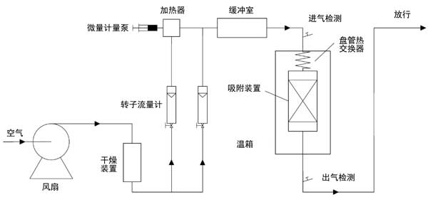 動態吸附技術用于測量甲苯吸附平衡等溫線。圖1描述了實驗裝置。通過該裝置獲得吸附飽和的活性炭。在不同的溫度和濃度下,測量了甲苯的飽和吸附容量。入口溫度和甲苯濃度設定為25–180℃和5–50g/m3。活性炭吸附的甲苯氣體濃度為15g/m3。使用重量分析技術測量吸附等溫線。實驗裝置以實驗室環境空氣為氣源,通過鼓風機將空氣送入裝置。在硅膠干燥裝置中除去水蒸氣后,通過數顯質量流量計的控制,按計算出的比例分成兩路。單向氣流以設定濃度進入氣體發生裝置,即甲苯揮發后的載氣,在氣體緩沖室中與反向流動的稀釋氣體充分混合后進入吸附系統。在吸附系統中,吸附柱緊密均勻地填充CTC100活性炭顆粒,并用鐵架垂直放置在設定實驗溫度的恒溫干燥箱中。混合甲苯氣體首先在恒溫干燥箱內通過氣體預熱管道達到實驗溫度,然后進入裝有活性炭的吸附柱進行吸附實驗。吸附氣體通過檢測口進入檢測系統,智能FID通過連續采樣測量甲苯出口濃度。當氣體發生裝置產生的入口濃度與智能FID檢測的出口濃度一致時,吸附柱中的活性炭達到吸附平衡。吸附氣體通過檢測口進入檢測系統,智能FID通過連續采樣測量甲苯出口濃度。當氣體發生裝置產生的入口濃度與智能FID檢測的出口濃度一致時,吸附柱中的活性炭達到吸附平衡。吸附氣體通過檢測口進入檢測系統,智能FID通過連續采樣測量甲苯出口濃度。當氣體發生裝置產生的入口濃度與智能FID檢測的出口濃度一致時,吸附柱中的活性炭達到吸附平衡。