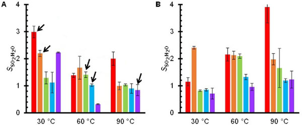 圖2:對于再生條件,五種活性炭在T=30、60和90℃的吸附溫度下的SO2/H2O選擇性。