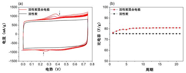 通過評估電化學(xué)性能,初步測試了活性炭復(fù)合材料作為混合電極的潛在應(yīng)用。為此,通過將浸泡在1M/H2SO4電解質(zhì)中的隔膜夾在兩個相同的電極(活性炭或混合材料)之間來組裝對稱電池。圖3a顯示了活性炭和混合材料在20mV/s恒定掃描速率下的循環(huán)極化(CP)曲線。由于雙電層電容(EDLC)的影響,交流對稱電池的CP曲線形狀為矩形。另一方面,活性炭混合電極觀察到準(zhǔn)矩形CP曲線NPs對稱細(xì)胞,具有源自納米銀的各種氧化還原波,與矩形(電容)包絡(luò)重疊。這種CP結(jié)構(gòu)表明法拉第和EDLC兩種電荷存儲機(jī)制的共存。值得注意的是,隨著循環(huán)次數(shù)的增加,觀察到的銀波變得更小并且變得難以察覺,這表明存在一定程度的不穩(wěn)定,正如對游離多金屬氧酸鹽納米銀所觀察到的那樣。白銀波浪的減少之間存在相關(guān)性(圖3a)在前幾個周期內(nèi),根據(jù)CP面積計算出的比電容有所增加(圖3b)。這可以通過氧化銀薄層與銀的比電容差異來解釋。盡管如此活性炭混合電極的比電容略高于裸活性炭電極,活性炭的比電容為75F/g,活性炭混合電極在20次循環(huán)后達(dá)到81F/g。該結(jié)果表明,混合材料具有電活性,并且在對稱超級電容器配置中超過了一定程度的交流電。活性炭和混合電極電池的比電容隨著電流密度的增加而降低。對于活性炭混合材料在掃描速率為2mV/s時最高值為83.5F/g,在掃描速率為50mV/s時進(jìn)一步下降至77.5F/g。高掃描速率下比電容的降低歸因于電解質(zhì)離子的低擴(kuò)散。由于時間限制,高倍率充放電過程中電解液中的離子運(yùn)動始終受到擴(kuò)散限制,僅利用外層活性表面進(jìn)行電荷存儲。減慢掃描速率可以讓電解質(zhì)更徹底地滲透到孔隙中,并與電極材料的內(nèi)表面有更多的接觸,從而導(dǎo)致電極表面存儲更多的電荷(更大的電容)。