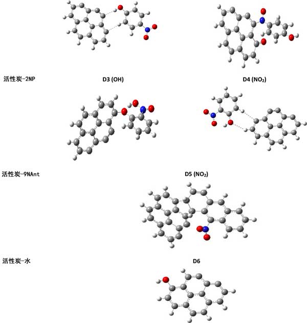 研究的第一步是描述代表固體活性炭吸附劑以及吸附物的分子結(jié)構(gòu)。在之前的理論工作中,已經(jīng)驗(yàn)證了石墨晶體結(jié)構(gòu)、苯環(huán)簇模型等不同分子結(jié)構(gòu)的適用性。選擇并修改了具有四個(gè)苯環(huán)的芘的模型以獲得最終的C16H6結(jié)構(gòu)。第二步,通過2NP、4NP、9NAnt和水的一個(gè)分子接近本體,衍生出復(fù)雜的結(jié)構(gòu)。第三步是研究水和污染物的共吸附以確定濕度所起的作用。在第四步中,將第二個(gè)污染物分子添加到先前計(jì)算的復(fù)合物中。