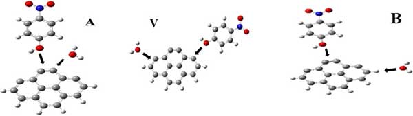 如上所述,為了啟動(dòng)對復(fù)合物優(yōu)化結(jié)構(gòu)的系統(tǒng)搜索,硝基苯酚和水分子均以選定的方向放置在距活性炭表面3Å的位置,覆蓋主體周圍的整個(gè)物理空間。兩個(gè)分子被設(shè)計(jì)為從不同的相對方向相互接近:(1)兩者都從本體的同一側(cè)進(jìn)行攻擊(A-初始構(gòu)型),(2)攻擊來自本體的相對側(cè)(V-初始構(gòu)型),(3)兩個(gè)分子遵循垂直路徑(B-初始構(gòu)型)。這三種方法如圖2所示。選定的初始構(gòu)型AB區(qū)分通過化學(xué)吸附或通過物理吸附連接的復(fù)雜結(jié)構(gòu)的形成。配置A有利于物理吸附,而配置V和B分別有利于完全和部分化學(xué)吸附。