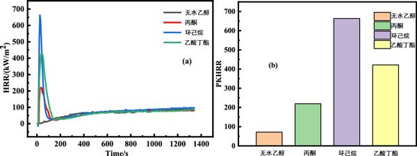 圖4b顯示了四個樣品的最大放熱率(PkHRR),其順序為環己烷(663.41kW/m2)>乙酸丁酯(421.4kW/m2)>丙酮(219.49kW/m2)>純無水乙醇(71.4kW/m2)。觀察到3個VOCs吸附樣品的PkHRR遠高于ROW,其中環己烷樣品的Pk放熱率最高,表明CYH樣品的燃燒危害最嚴重。