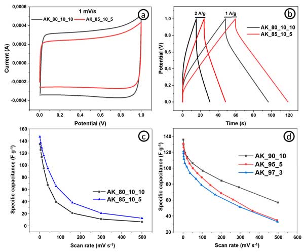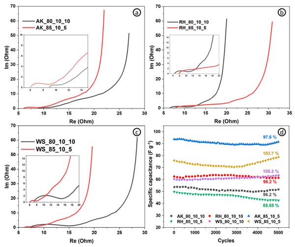 活性炭電極表現(xiàn)出比常規(guī)樣品更好的比電容和能量密度(相同功率密度下的最大能量密度為4.8vs.4.4Wh/kg-1),因為有更多的活性材料,而電阻、倍率能力(圖3c)和功率密度—這取決于電極的導(dǎo)電能力(基于導(dǎo)電添加劑含量)。圖3d顯示了具有不同活性炭和碳納米管含量的電極在不同掃描速率下的比電容。碳納米管含量為10%的電極在1mV/s-1下實現(xiàn)了137F/g-1的最高比電容。從圖中可以清楚地看出,就比電容而言,活性炭和碳納米管的最佳比例為90:10。綜上所述,我們可以得出這樣的結(jié)論:對于超級電容器的自支撐電極,活性成分、結(jié)合成分和導(dǎo)電成分的最佳比例為85:10:5。可以進一步評估具有這種含有源自其他生物前體的活性材料的組合物的電極的電化學(xué)性能。