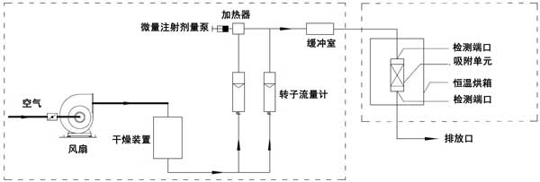 動態(tài)吸附實驗在室溫(25℃)下進行。實驗裝置由氣體分配系統(tǒng)和吸附系統(tǒng)兩部分組成。吸附系統(tǒng)由恒溫箱和吸附單元組成。檢測口位于吸附系統(tǒng)之前和之后。動態(tài)法測定活性炭對脈沖負荷緩沖性能的裝置如圖1所示。本實驗以乙醇或二甲苯為單一檢測對象。氣體分配系統(tǒng)包括風扇、干燥裝置、轉(zhuǎn)子流量計、微注射計量泵、加熱器和緩沖室。使用FT-IR傅里葉氣體分析儀作為測量設(shè)備。在氣體分配系統(tǒng)中,在短時間內(nèi)(2分鐘和5分鐘),微注射計量泵的注射量迅速增加到原始體積的預(yù)定倍數(shù)(10倍和20倍),以產(chǎn)生脈沖負載。在吸附系統(tǒng)中,吸附單元內(nèi)放置活性炭。吸附單元的直徑為31mm。活性炭的填充高度分別為2cm、4cm、6cm、8cm。將吸附裝置置于恒溫箱內(nèi)。吸附劑和吸附物的入口空氣保持在室溫。進行了吸附劑在室溫下吸附吸附質(zhì)的脈沖加載實驗。潔凈空氣通過干燥裝置后,利用轉(zhuǎn)子流量計將其按特定比例分成兩個通道。通過微注射泵將特定濃度的乙醇或二甲苯氣體注射到氣體中。另一種氣體用作稀釋氣體。兩種氣體流入緩沖室,完全混合后進入恒溫箱。穩(wěn)定的氣體按照實驗設(shè)定的濃度、流量和溫度進入吸附單元。在通過吸附單元之前和之后測量乙醇或二甲苯的濃度。