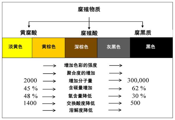 腐殖質(zhì)的性質(zhì)與其成分有非常密切的聯(lián)系,其成分受到腐殖化過程的影響,與分子(分子量)和顆粒的大小、分散程度(真溶液或膠體溶液)、極性(由這些決定)由骨架的性質(zhì)(芳香族;脂肪族)決定,主要是官能團的類型、數(shù)量和解離能力。腐殖質(zhì)成分的功能在于其在水中的溶解度(黃腐酸的溶解度比腐植酸高,因此天然水中平均含有87%的黃腐酸)、聚集能力、解離能力(主要是羧基)官能團)和相關的電荷比(粒子的zeta電位)。腐殖質(zhì)的一些特性也受到水的成分及其pH值的影響。圖1顯示了腐殖質(zhì)的基本特性。