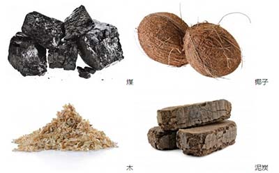 最常用的原料是煤(無煙煤,煙煤,亞煙煤和褐煤),椰殼,木材(軟和硬)和泥炭。許多其他原材料已被評估,如堅果殼,橄欖石和棕櫚仁,但它們的商業限制總是在于原料供應。