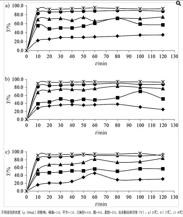 所用活性炭的濃度是控制吸附的重要因素。眾所周知,溫度是影響任何吸附過程的附加因素。因此,在三個不同的溫度,室溫(25℃),高于(40℃)和波紋管(10℃)下進行測試。為了觀察溫度和吸附劑量對多酚吸附的同時影響,吸附劑濃度從1至8g / 100mL變化。使用相同數量的廢水(25mL)和恒定的酚濃度(3.0mg / mL)進行不同的測試,但改變活性炭的量(0.25、0.5、1.0、1.5和2.0g)。在圖中可以觀察到不同溫度下的吸附趨勢。