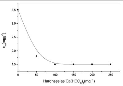 選擇的共存離子是通常在地下水中發現的碳酸氫鈣,并造成暫時的硬度。在圖2中證明了這一點。在Ca(HCO 3)2存在下,硝酸鹽的去除率明顯降低。這些物質的抑制作用可歸因于NO 3 -和HCO 3 -離子的相同結構。它們都是平面的,并且N-O和C-O鍵之間的角度是相同的并且等于120℃?梢院侠淼赜纱苏J為,HCO 3個 ˉ陰離子競爭性吸附到相同的活性位點的RS的表面上。