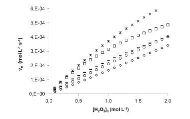 在圖4中溫度的效果示于初始反應速率,這取決于過氧化氫的初始濃度時活性炭的質量-體積比為2,00x10 -3克·毫升-1。