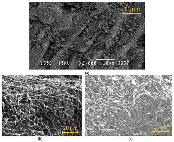 圖1.樣品的掃描電子顯微照片:(a)活性炭-H3PO4,(b)活性炭-CO2和(c)活性炭-H2O.
