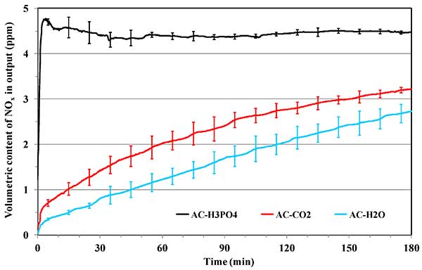 盡管用于汽車和工業廢氣都實施了減排措施,城市人口與車輛的增加導致了更多氮氧化物的排放。使用木質纖維為前體制造的活性炭在環境溫度去除氮氧化物。這些活性炭吸附劑表現出令人感興趣的吸附容量范圍在40mg/g和120mg/g之間。然而,這些活性炭的性能通常在干燥和潮濕條件下在空氣存在下在500-1000ppmNO濃度下進行評估。