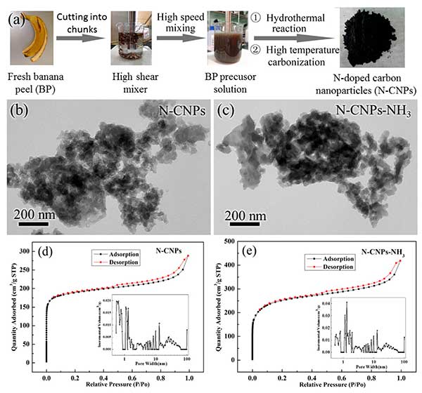 圖1.(a)從新鮮香蕉皮制成活性炭的過程的描述。(b)活性炭和(c)氨活化的活性炭TEM圖像。(d)活性炭和(e)氨活化的活性炭氮吸附等溫線和相應的孔徑分布。