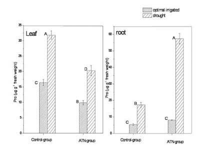 當(dāng)葉片中的游離脯氨酸含量降低時(shí),表明當(dāng)存在活性炭混合物時(shí),干旱條件下植物的生理?yè)p傷水平降低。這種影響可能是由于天然硅鋁酸鹽存在的濕度增加。盡管干旱條件誘導(dǎo)了對(duì)照組和活性炭混合物組的根中游離脯氨酸含量的顯著增加,但活性炭組中這種增加更為顯著。活性炭混合物組植物根中游離脯氨酸含量極高,增加了脯氨酸的保護(hù)作用,脯氨酸在植物組織中起到滲透物質(zhì)的作用:使植物更有效地吸收干旱土壤中的水分。