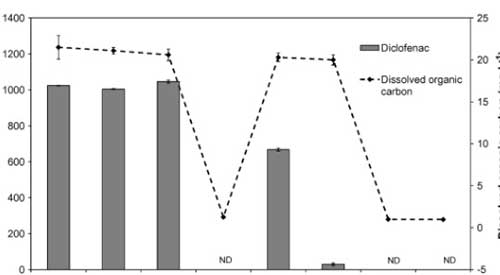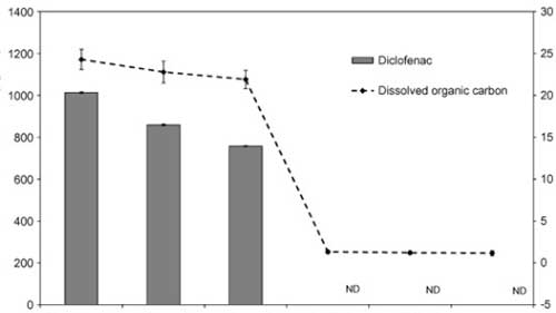 使用活性炭除去雙氯芬酸鈉是定性高效的,通過零吸收和低濃度的DOC的,并且在通過所獲得的色譜中沒有檢測到雙氯芬酸鈉。得在所研究的處理階段中,在活性炭上的吸附導致最顯著的雙氯芬酸鈉去除。因此,雙氯芬酸鈉沒有水樣中的這個階段(LOD之后檢測 = 2 μg L−1)。考慮到所述方法的定量限為3 μg L−1,通過活性炭除去雙氯芬酸鈉的至少99.7%。因為沒有研究活性炭的破裂曲線,所以活性炭的結果可以被認為是定性的。然而,為了研究在大型水處理廠中去除雙氯芬酸鈉,必須改進該方法以達到較低的檢測限(約μg L−1)。