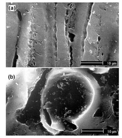 圖1:(a)純凈活性炭和(b)聚乙烯亞胺浸漬活性炭的SEM顯微照片。
