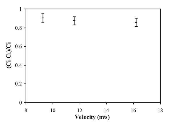 旋風分離器系統對應于具有強大的慣性力場的移動床粒子。雖然活性炭尺寸和流速兩個參數在吸附過程中都起著關鍵作用,但顆粒尺寸有更明顯的趨勢。基于劇烈的湍流,高流速形成更好的混合條件,但使吸附劑顆粒的停留時間極短,這可能降低與旋風分離器內的目標氣體流動的接觸概率。例如,350升/分鐘(1pm)的流速導致16.2米/秒的入口速度,從而導致在旋風分離器的混合室內停留時間大約為0.14秒。因此,為了有效利用活性炭顆粒直至完全吸附,顆粒應盡可能多次重復使用。