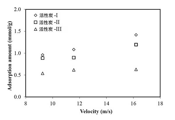 間歇填充床試驗中,活性炭對于甲苯蒸氣的吸附容量,即最大容許吸附量,從各種尺寸的活性炭的等溫實驗中發現為0.01-0.03mol / g。第一次施加到以16.2米/秒運行的旋風分離器的新鮮吸附劑的吸附量對于活性炭-I是1.4mmol / g,對于活性炭-II是1.2mol / g和對于活性炭-III,如圖2所示。它僅僅小于活性炭吸附劑潛在容量的1/10。該旋風分離器中甲苯的吸附量與交流流化床反應器的體積(3.3〜5.4mmol / g 活性炭)相當競爭。至于尺寸效應,小顆粒提供大單位體積的表面積,這可以呈現更多潛在的吸附位點。對于活性炭-I、II、III,各尺寸范圍的面積分別為1145,1034和912m2/ g。