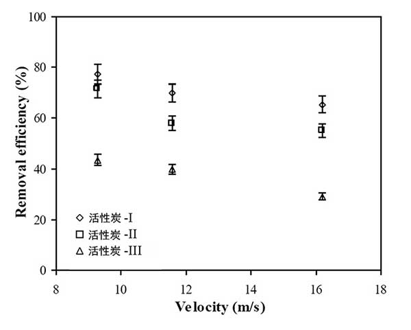 流速同時影響氣體吸附和活性炭回收,因為它涉及氣體和活性炭顆粒的混合程度、。圖3在各種活性炭吸附劑尺寸下,氣體去除效率和流量之間呈現出輕微的反比關系。最小的吸附劑(活性炭-1)以9.26米/秒除去77.4%的甲苯蒸氣,然后以16.2米/秒降至65.4%。微粒活性炭吸附劑捕獲沿著旋風分離器的流動路徑行進的甲苯蒸氣。雖然在前面的的內容說過吸附量以高速增加,但是氣體去除效率相當低。這是因為在高流量下甲苯的絕對體積要高得多。因此,即使活性炭吸附得更多,更多的氣體分子傾向于流出而沒有在內部吸收。因此,關于顆粒回收和氣體去除效率的最佳流量必須通過在各種操作條件下的眾多實驗來確定。